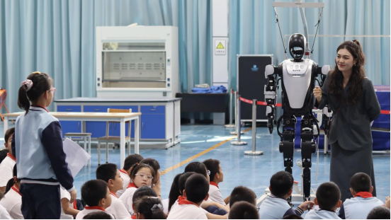 在机器人展示环节,金老师重点介绍了具身机器人的技术原理与应用场景。通过模拟人类动作的仿生机器人,孩子们直观感受到智能交互技术的精妙之处,纷纷举手提问:“机器人能识别我们的表情吗?”“它们如何学习新动作?”金老师一一解答,将复杂的科技知识转化为趣味科普。